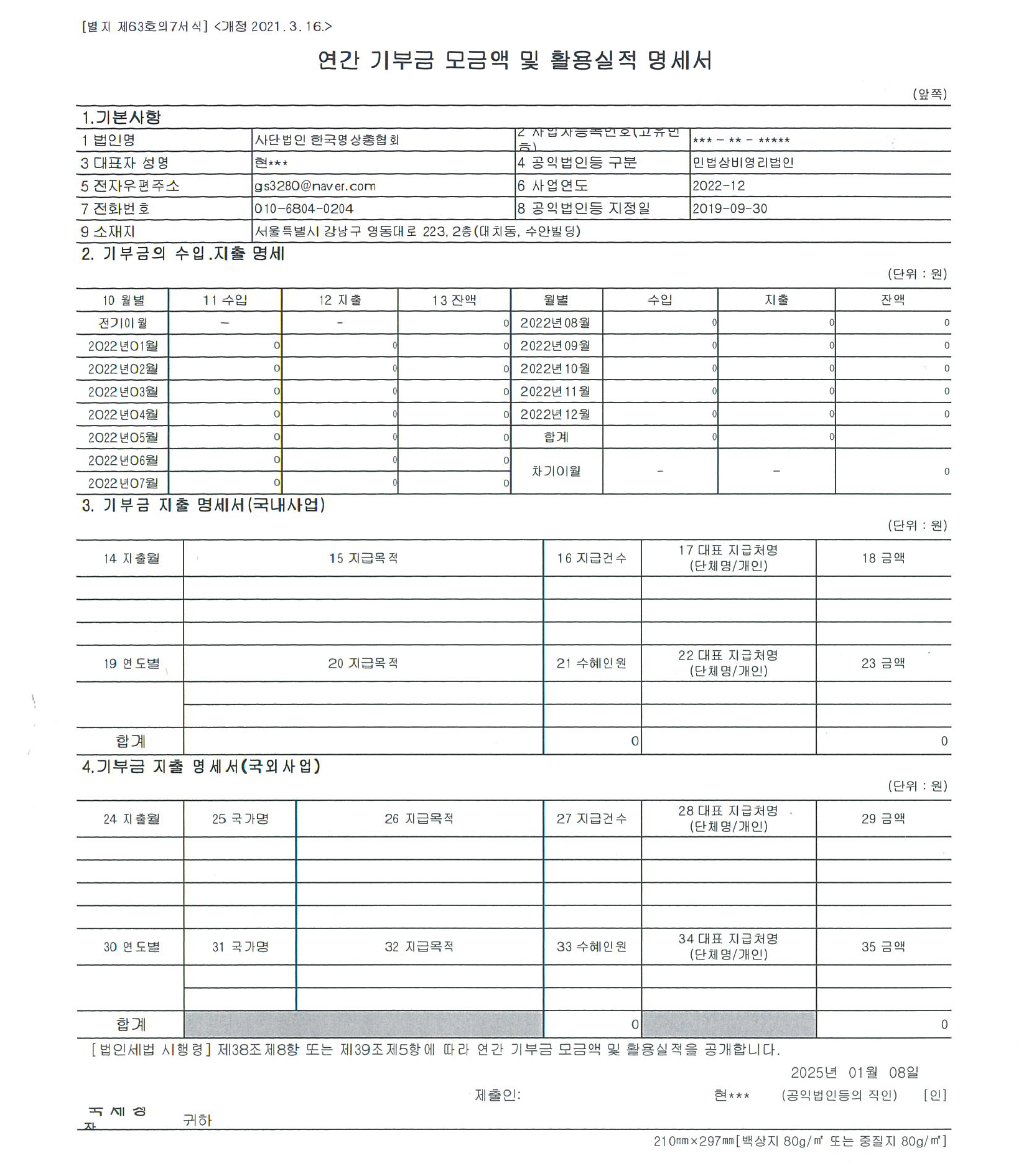 2022년 연간 기부금 모금액 및 활용실적 명세서