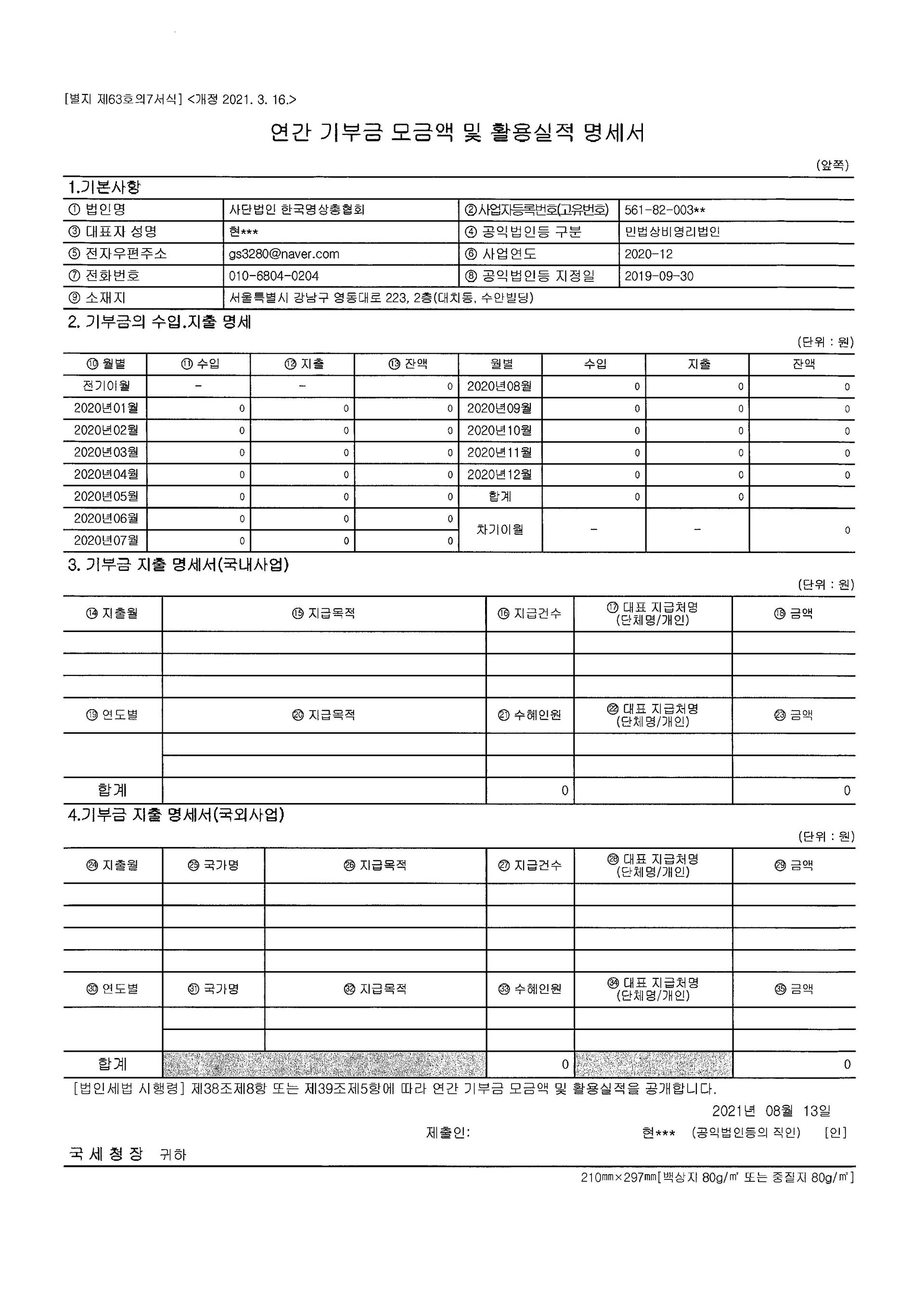2020년 연간 기부금 모금액 및 활용실적 명세서
