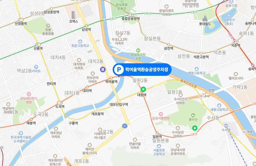 - 장시간 수행을 겸할 계획이시라면 학여울 역의 지하에 시영주차장을 이용하세요.