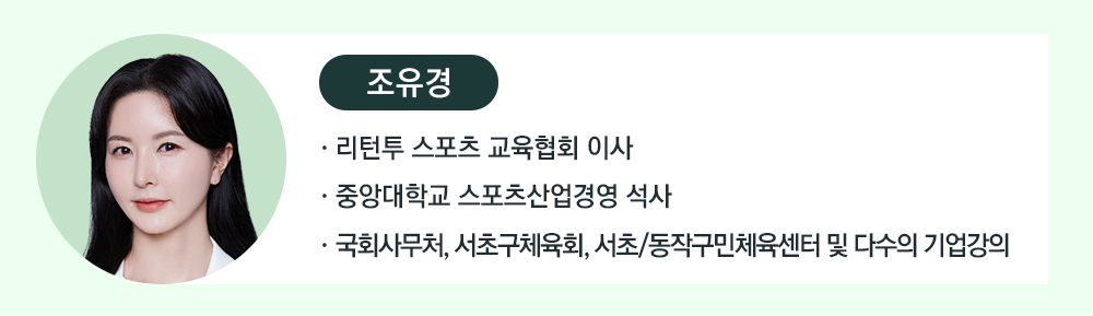 조유진 강사는 스포츠 및 건강 분야에서 폭넓은 경험과 전문성을 갖춘 지도자이다. 중앙대학교에서 스포츠산업경영 석사 학위를 취득하며 이론적 깊이를 더하였고, 리턴투 스포츠 교육협회 이사로 활동하고 있다.