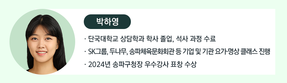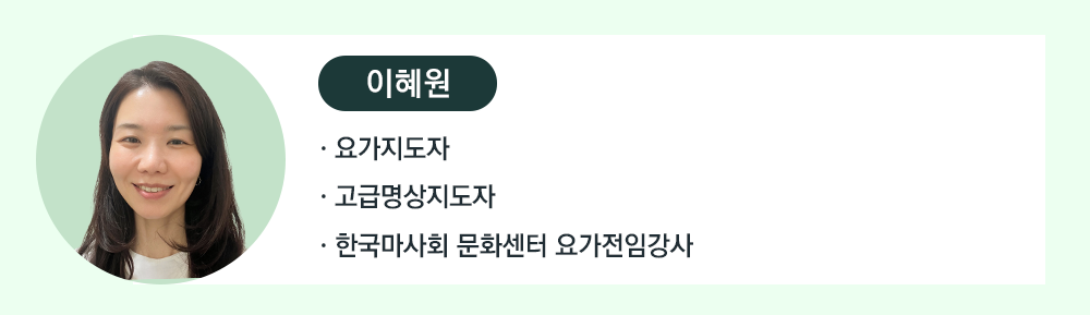 이혜은 강사는 요가지도자 및 고급명상지도자 자격을 갖추고 있으며, 한국마사회 문화센터 요가 전임강사로 활동하며 풍부한 지도 경험을 쌓았다.