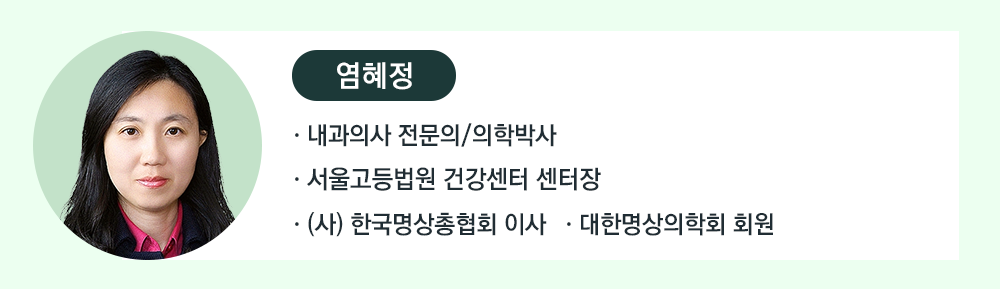 염혜정 의사는 내과 전문의로서 의학박사 명상 전문가이다. 현재 서울고등법원 건강센터장으로 실제 임상 현장에서 정확하고 전문적인 의학 지식으로 명상 치유와 건강 증진에 깊은 이해를 가지고 있다.