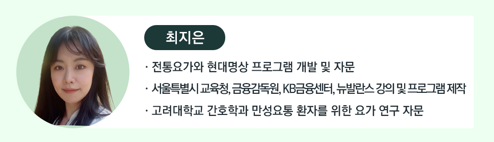 최지은 강사는 전통 요가와 현대 명상 프로그램을 개발하고 자문하며 쌓은 전문성을 바탕으로, 서울특별시 교육청, 금융감독원, KB금융센터, 뉴발란스 등 다양한 기관에서 강의 및 프로그램을 제작하였다. 고려대학교 간호학과 만성요통 환자를 위한 요가 연구 자문을 맡을 정도로 그 실력을 인정받고 있다.