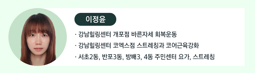 이정윤 강사는 바른 자세와 코어 근육 강화에 특화된 전문가이다. 강남힐링센터 개포점에서 바른 자세 회복 운동을 지도했고, 코엑스점에서는 스트레칭과 코어 근육 강화 수업을 진행하며 수많은 분들의 자세 개선과 통증 완화에 기여하였다.