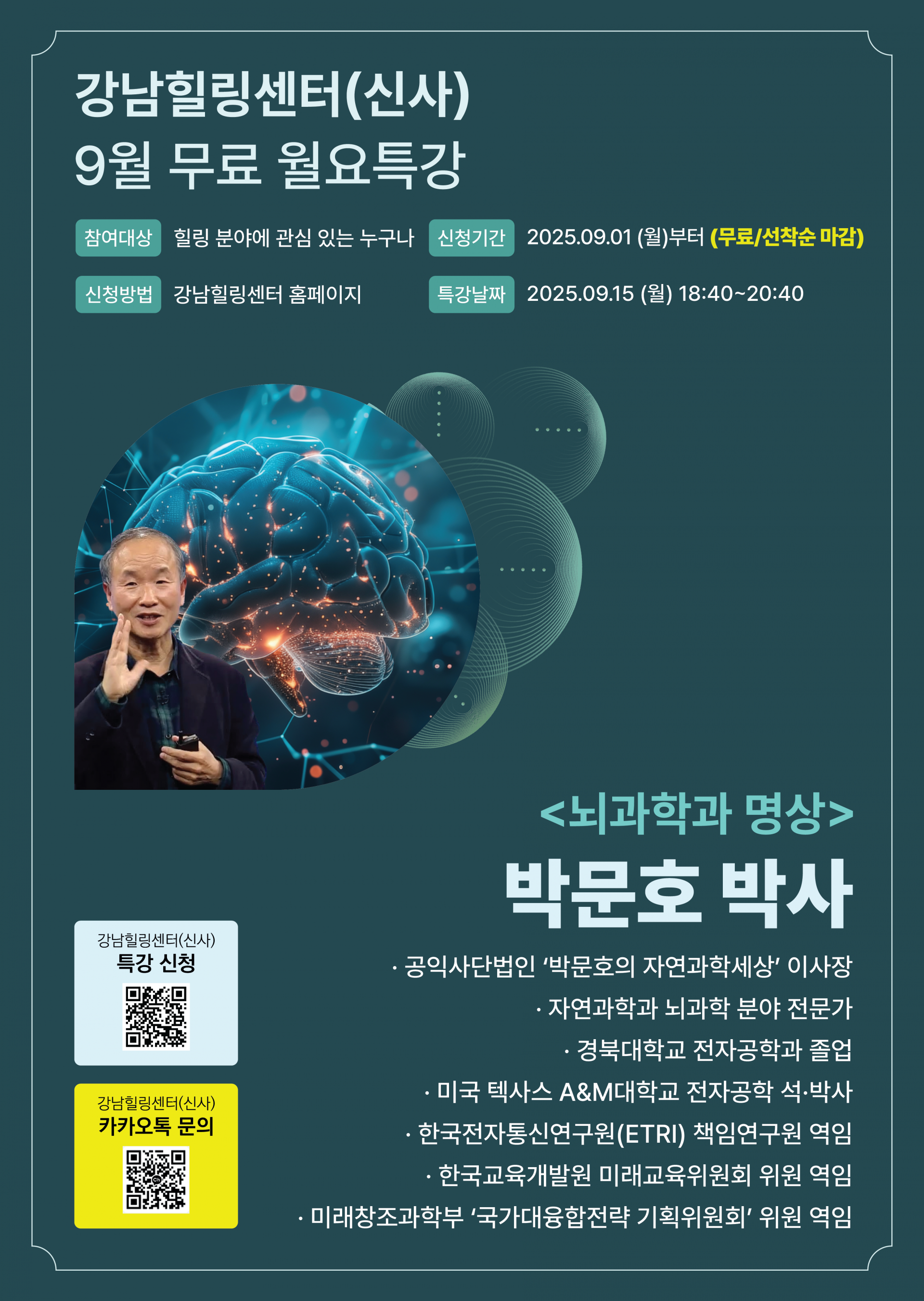 힐링에 관심 있는 분이라면 누구나 참여하실 수 있는 열린 강연으로, 첫번째 특강에는 뇌과학 분야의 권위자이신 박문호 박사님을 모시고 강연을 준비했어요! ^^