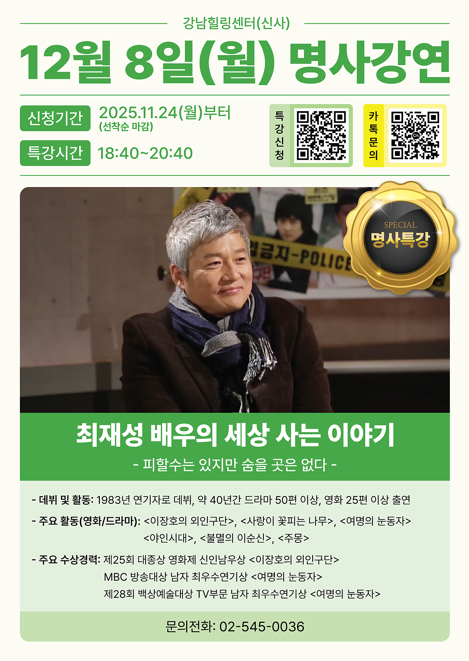 12월 8일 월요일, 강남힐링센터(신사)에서 최재성 배우님과 함께하는 귀한 성찰의 시간을 경험하시기를 바랍니다. 여러분의 많은 관심과 참여 기다리겠습니다! 🤗