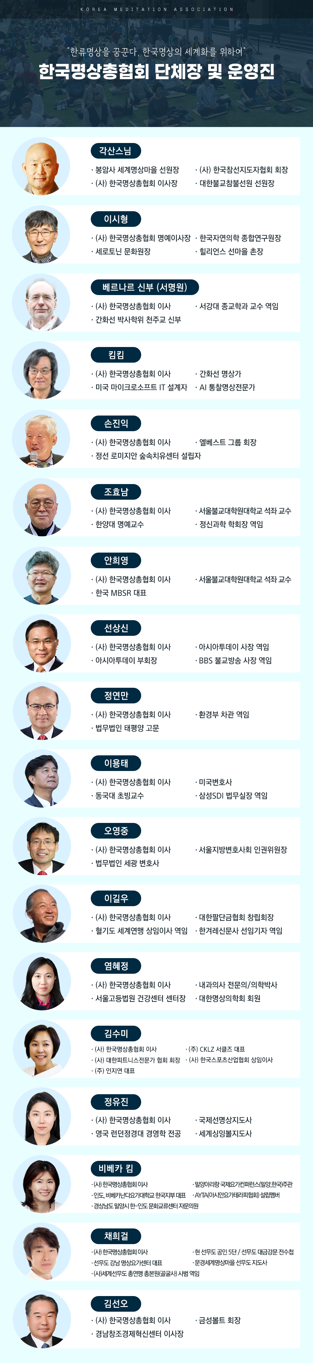 한국 고유의 K명상과 참선, 정신의학, 정신과학, 언론, 기업, 법조계 분야에 저명한 최고의 명상 지도자들을 통해 명상지도사를 양성하고, 사회와 기업, 국민 정신건강과 명상문화, 청소년 인성개발에 기여 하고자 뜻을 모아 결성한 공익 단체입니다.